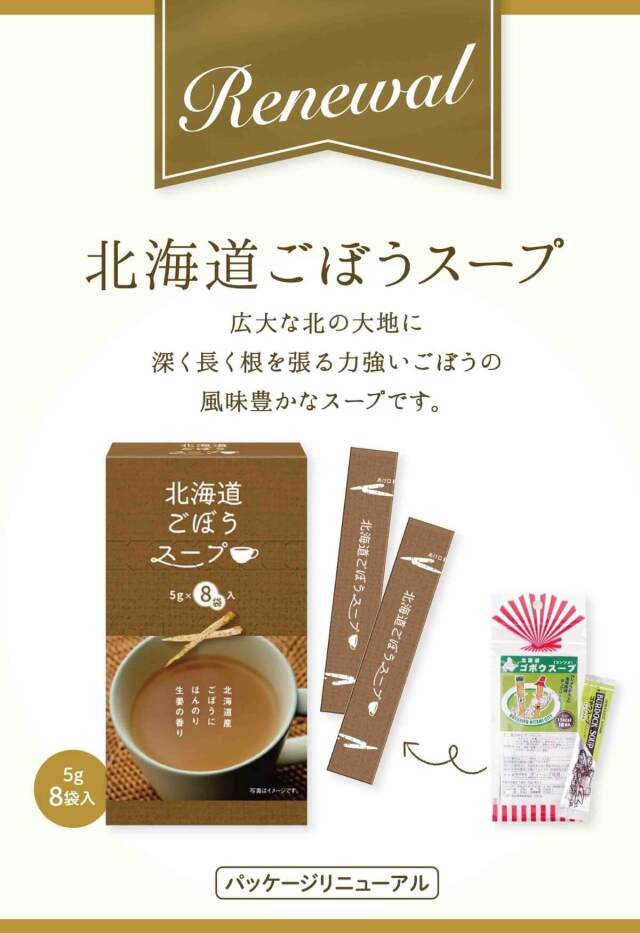 風味・食味・汎用と三拍子揃った、美味さプラス「利便性」を活かした顆粒状のスープです。メインの“ゴボウ”はもちろん地元「北海道北見地方産」を使用し、 「食物繊維」も7%以上とタップリ含んでおります。更には“しょうが”入りですので身体も温まり、特に冬場にはお奨めの逸品です。